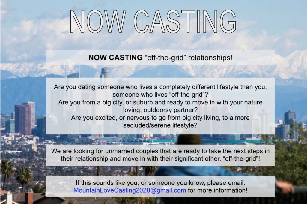 Sharp Entertainment has a current casting call targeting Maine, New Hampshire, Vermont, New York and Alaska looking for couples ready for a new reality TV docu-series. Using the tentative name “Mountain Love” while it’s being cast, the show will follow existing couples where one half is willing to move from the city to live with their off-the-grid partner.