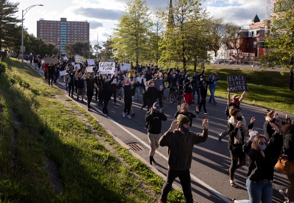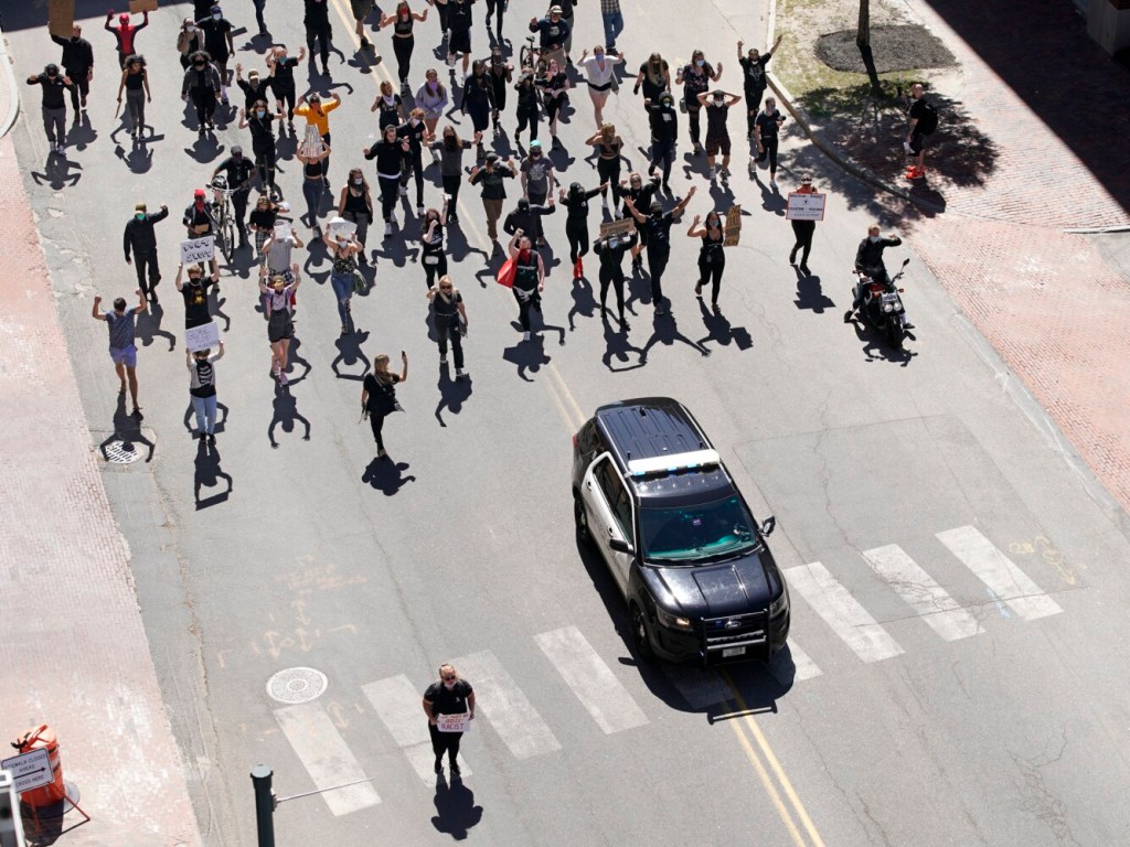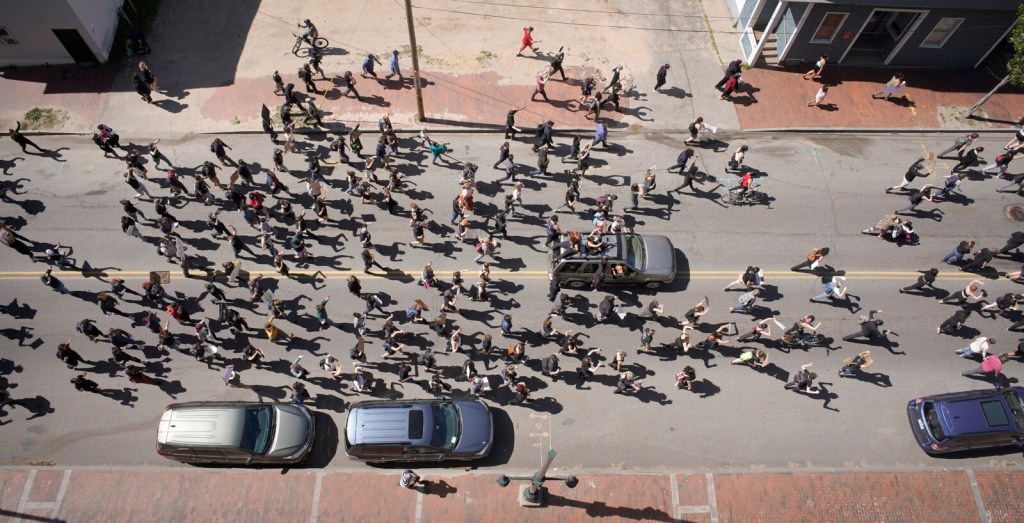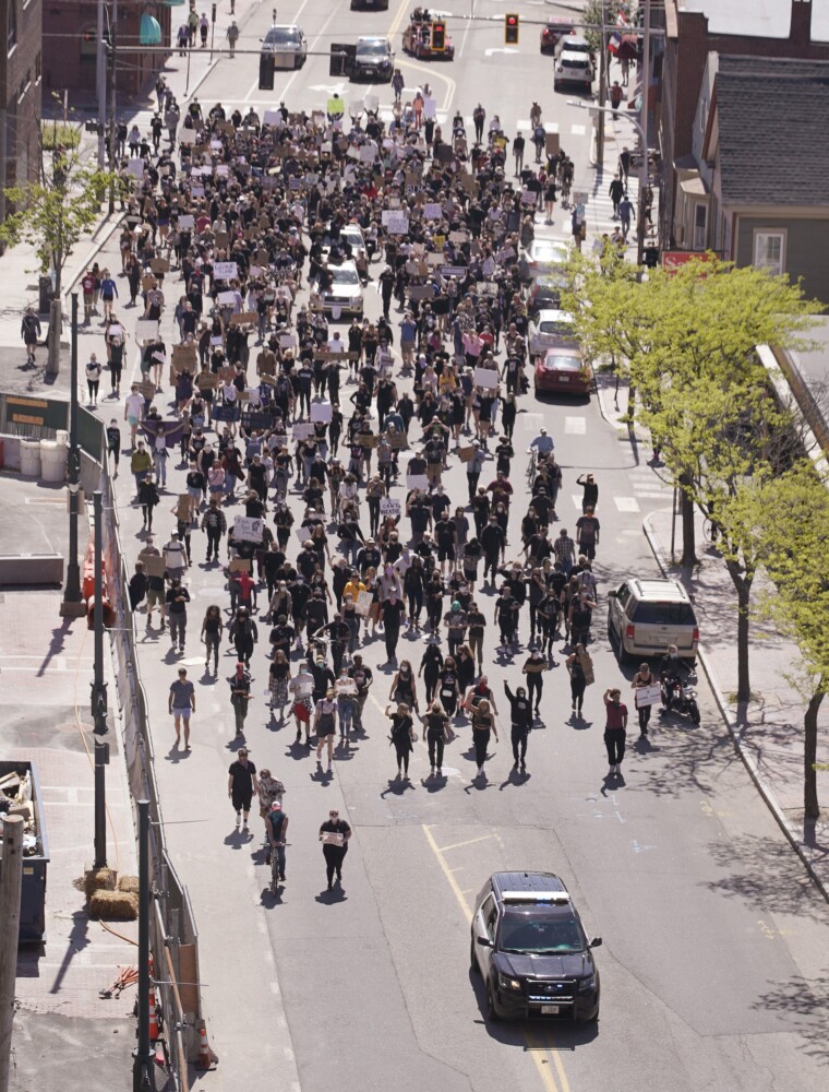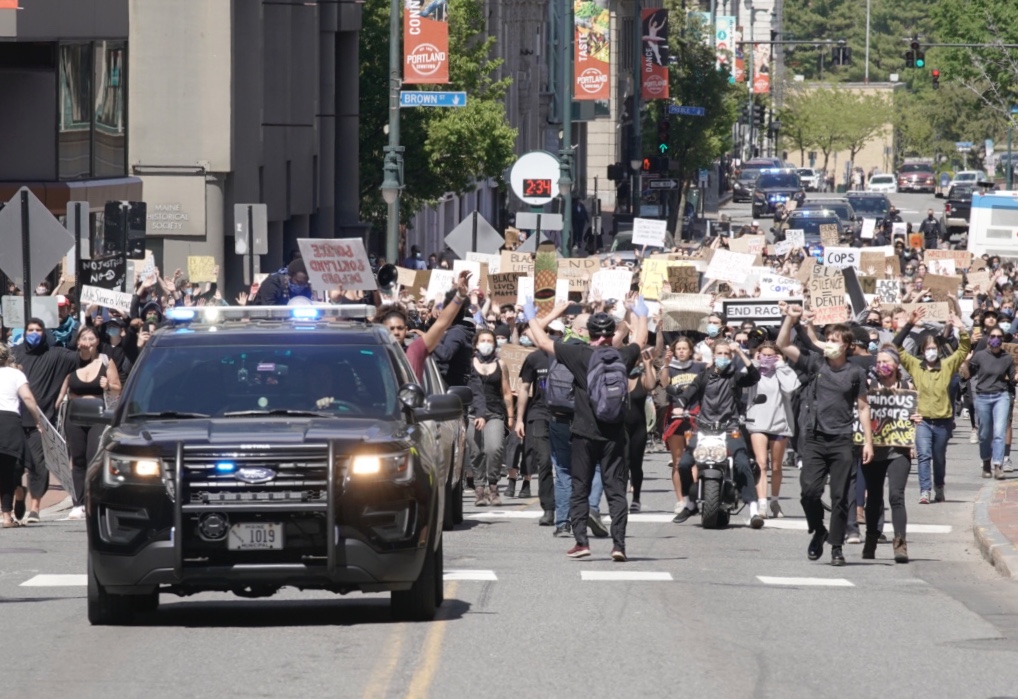 The death of George Floyd has sparked protests across the country, and in Portland hundreds of demonstrators marched down Congress Street on Sunday, chanting, “No justice, no peace! No racist police!”