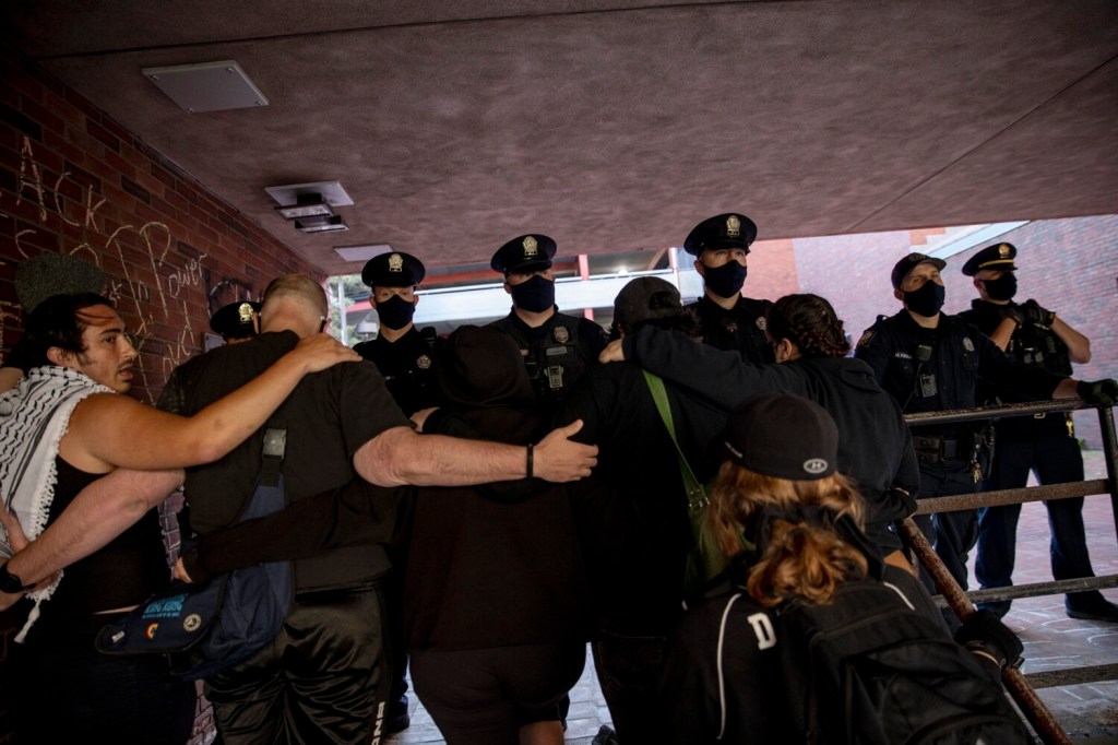 For a moment, the confrontation appeared ready to escalate. A chain of protesters with linked arms blocked the stairs leading to the police station. Each wrote a phone number on their arm – someone to bail them out if they were arrested, they said.
