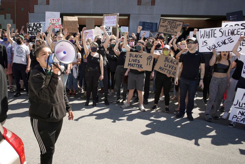 Police officers stood at the top of the steps leading to the police station, and Lt. Robert Doherty addressed the crowd, telling them the department shared the goal of keeping people safe. Still, he asked protesters to disperse for public safety during the coronavirus pandemic.