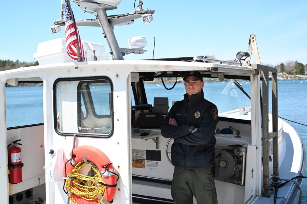 Marine Patrol Officer Evan Whidden stands for a portrait on the patrol boat May 14. Shawn Patrick Ouellette/Staff Photographer