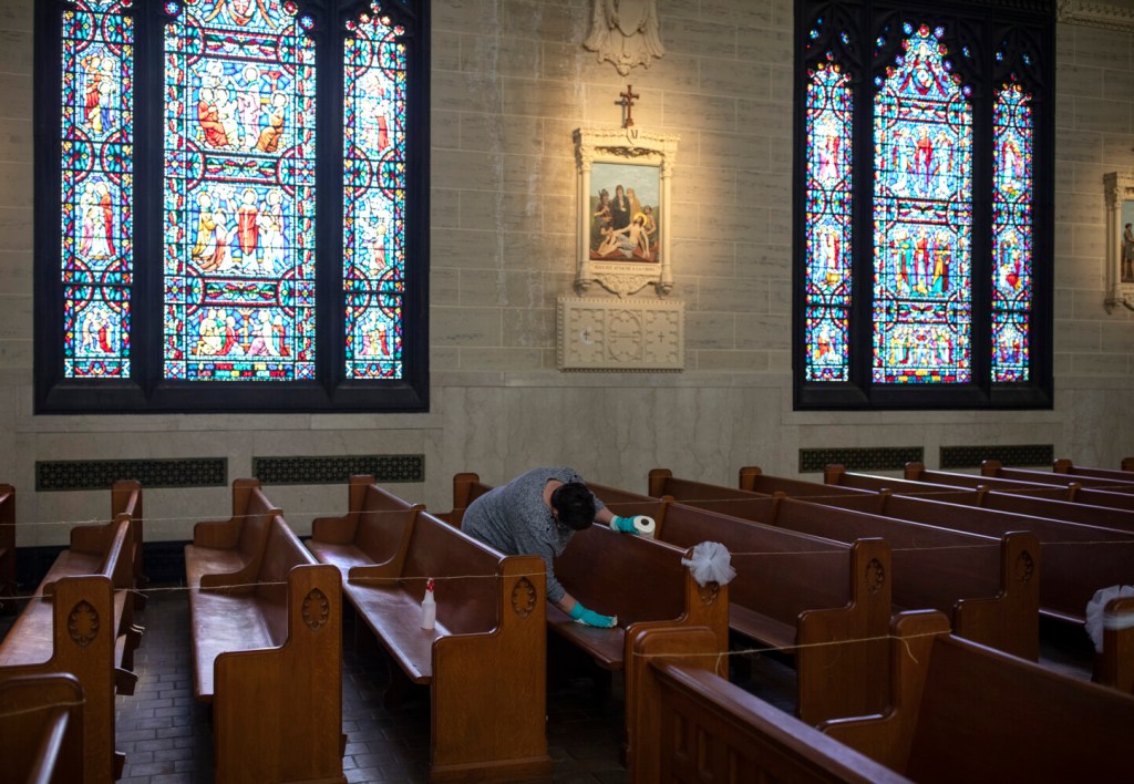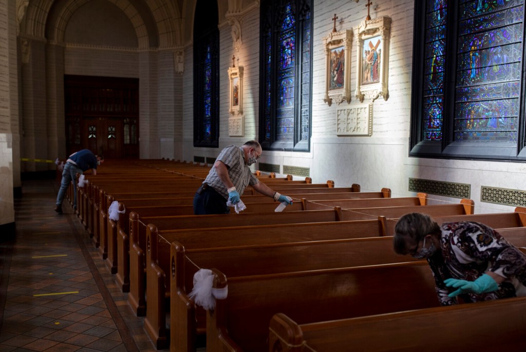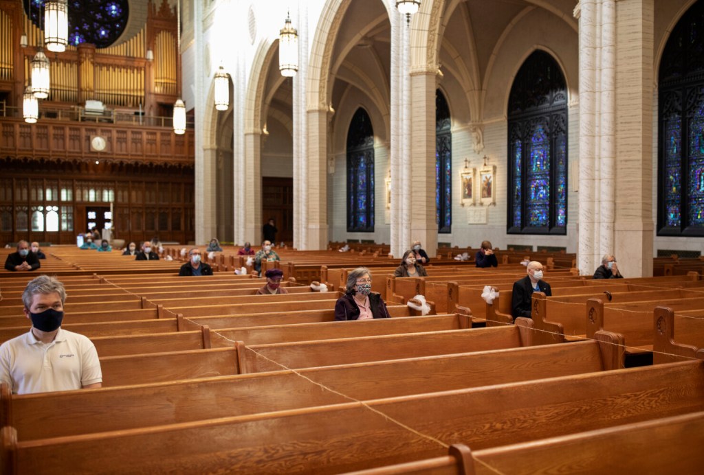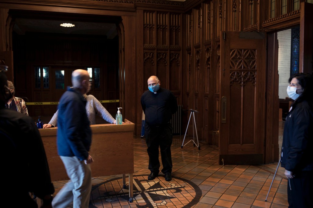Parishioners and priests wore face coverings, only 50 people were allowed inside and most of the pews were blocked off to prevent parishioners from sitting too close to one another, among other new procedures.