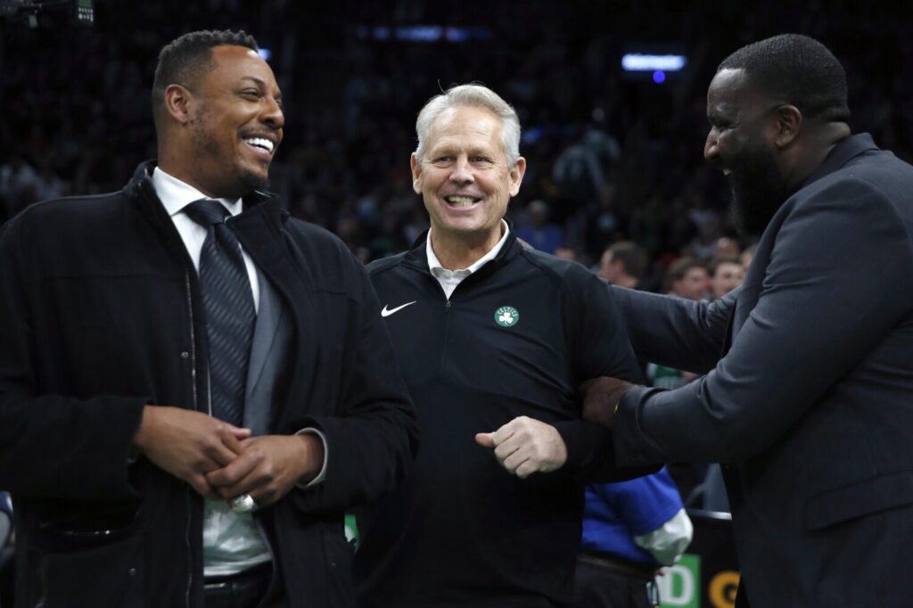 Boston Celtics President of Basketball Operations Danny Ainge, center, shown with former Celtics Paul Pierce, left, and Kendrick Perkins during a game on Feb. 29, is ready for the NBA to return and will accept whatever format is chosen for the playoffs, placing his faith in Commissioner Adam Silver. Michael Dwyer/Associated Press