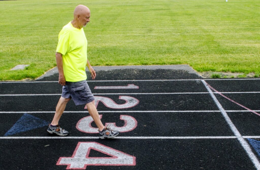Pridham pounds the pavement with a look of determination to finish his 16 laps — or four miles. Not even a recent surgery can keep Pridham down. As he explains during his walking workout, exercise and a well-balanced diet have become priorities as he’s gotten older. He also makes sure to play tennis about three times a week.