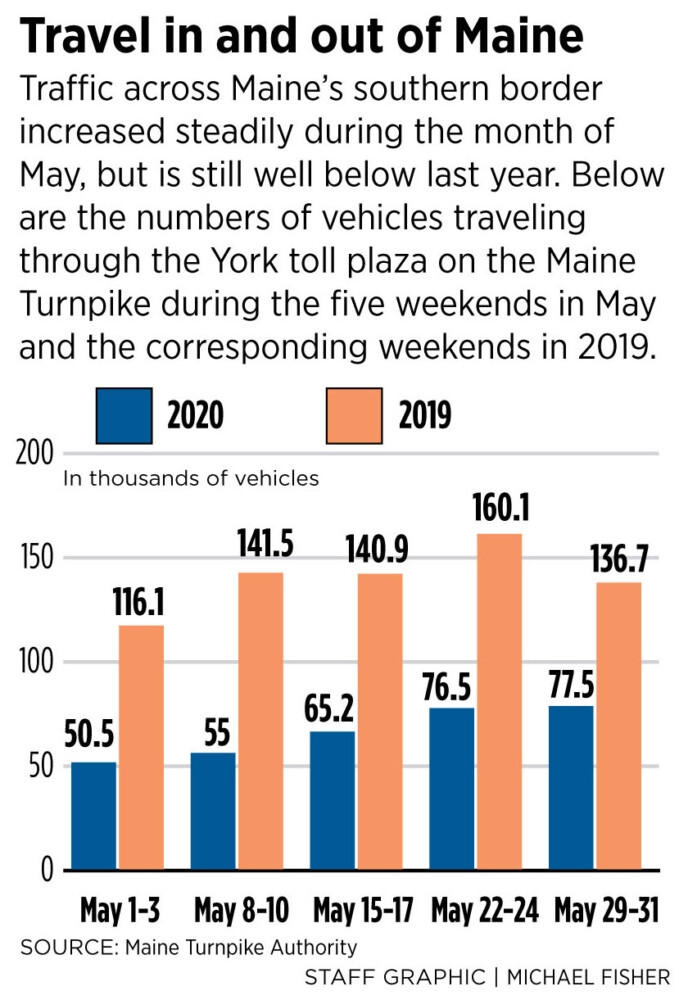 Data from the Maine Department of Transportation also show that more cars are out on Maine roads than earlier this spring, but still far fewer than last year.