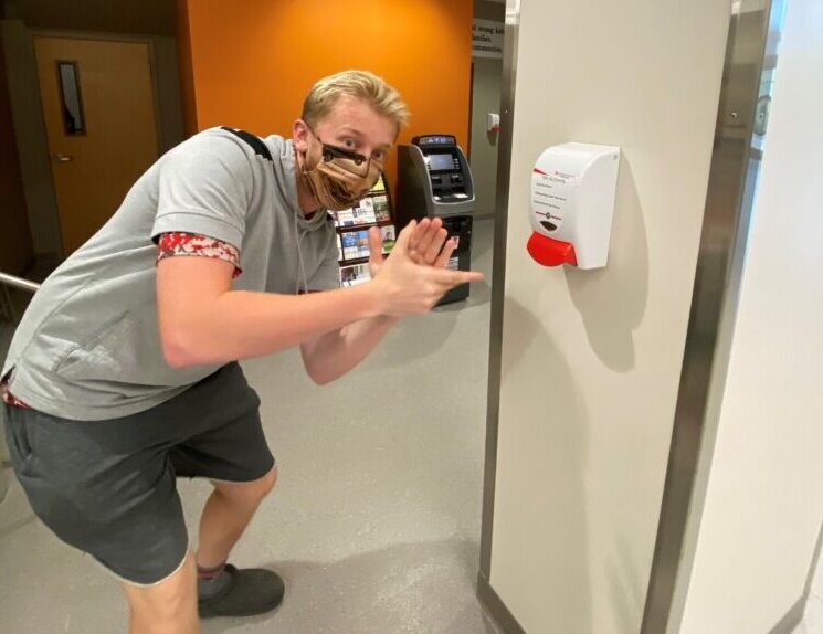 Darren Forkey, assistant welcome center coordinator at the Alfond Youth Center, uses one of the hand sanitizer stations the center has installed. Photo provided by Crista Lavenson, Alfond Youth and Community Center