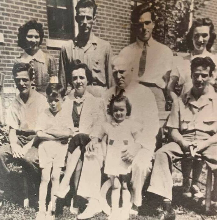 J.P. Devine, the young boy at bottom left, is seen with his family in a circa 1941 photo. His father, Mathias, and mother, Veronica, are sitting in the center, surrounded by the other Devine children. Photo courtesy of J.P. Devine