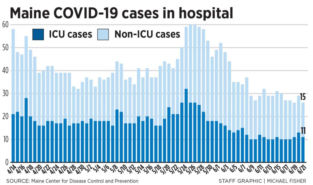Of the 26 patients in Maine hospitals with COVID-19 on Sunday (three fewer than Saturday), 11 were in intensive care (two fewer than Saturday) and five were on ventilators. The state had 147 intensive care unit beds available of a total 385, and 266 ventilators available of 319. There were also 441 alternative ventilators that can breathe for patients with acute cases.
