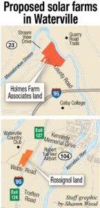 WATERVILLE — The Planning Board on Monday will consider making recommendations to the City Council about creating a solar farm district in the zoning ordinance and rezoning properties on Webb and County roads so that solar farms may be developed there.