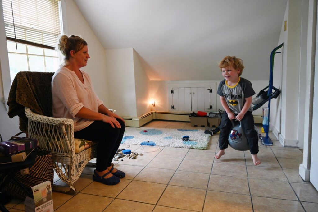 Rebecca Giles watches her son play on a bouncing ball at their apartment. Shawn Patrick Ouellette/Staff Photographer