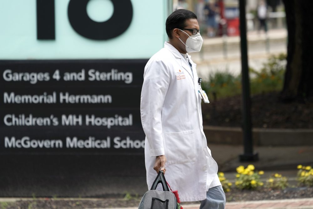 A healthcare professional walks through the Texas Medical Center on Thursday in Houston. The leaders of several Houston hospitals said they were opening new beds to accommodate an expected influx of patients with COVID-19, as coronavirus cases surge in the city and across the South. David J. Phillip/Associated Press