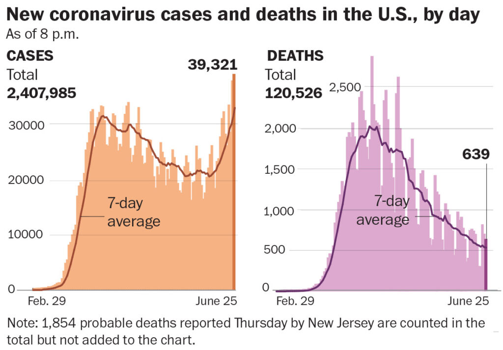 Justin Lessler, a researcher at Johns Hopkins Bloomberg School of Public Health, said 20 million infected “is about what you’d expect based on the case fatality rate” and the number of deaths that have occurred so far in the U.S.