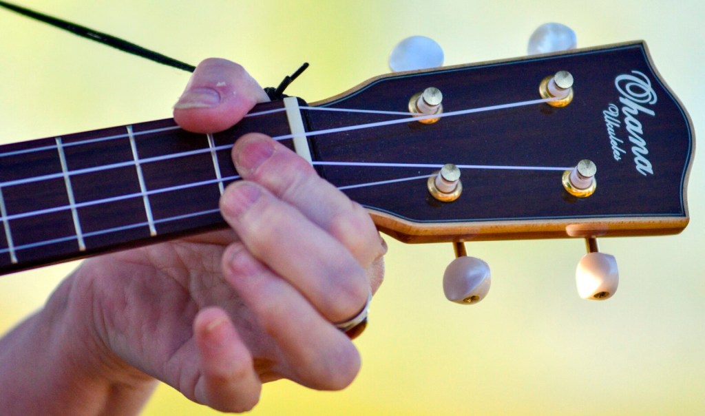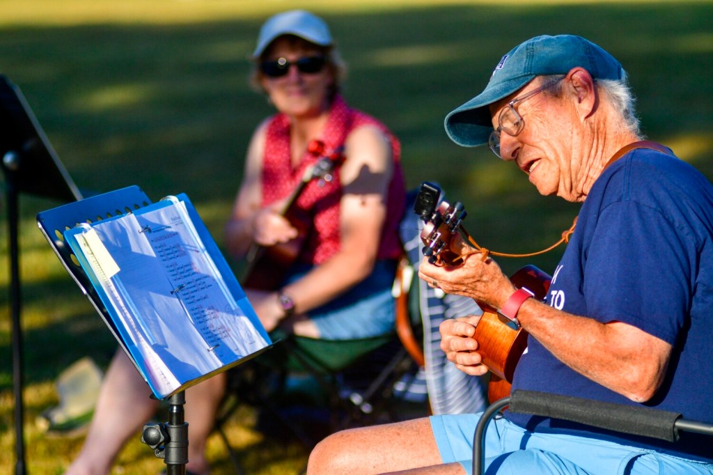 The Bailey Ukulele group meets Thursdays near the shores of Maranacook Lake in Winthrop’s Norcross Point. The group’s rehearsals alternate weekly between them all singing and playing songs together and taking turns doing a solo. Founded about six years ago by Lucinda Coombs and Ellie Schneid, there are about 25 people on membership list. The group usually get 12-14 at rehearsals. Before the coronavirus pandemic changed everything, they rehearsed at the the C.M. Bailey Public Library in Winthrop.