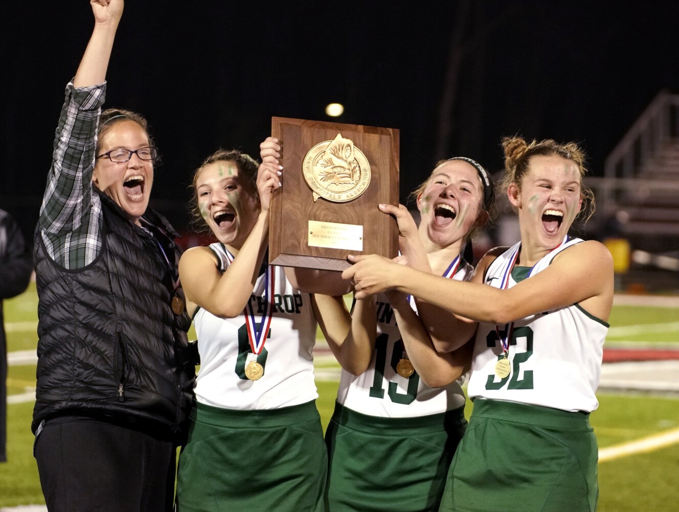 Winthrop field hockey coach Jessica Merrill, left, celebrates with captains Brooklyn Gaghan, Gia Francis and Kerrigan Anuszewski, after the Ramblers sank St. Dominic in the Class C South title game last season in Sanford. Gregory Rec/Portland Press Herald file photo Buy this Photo