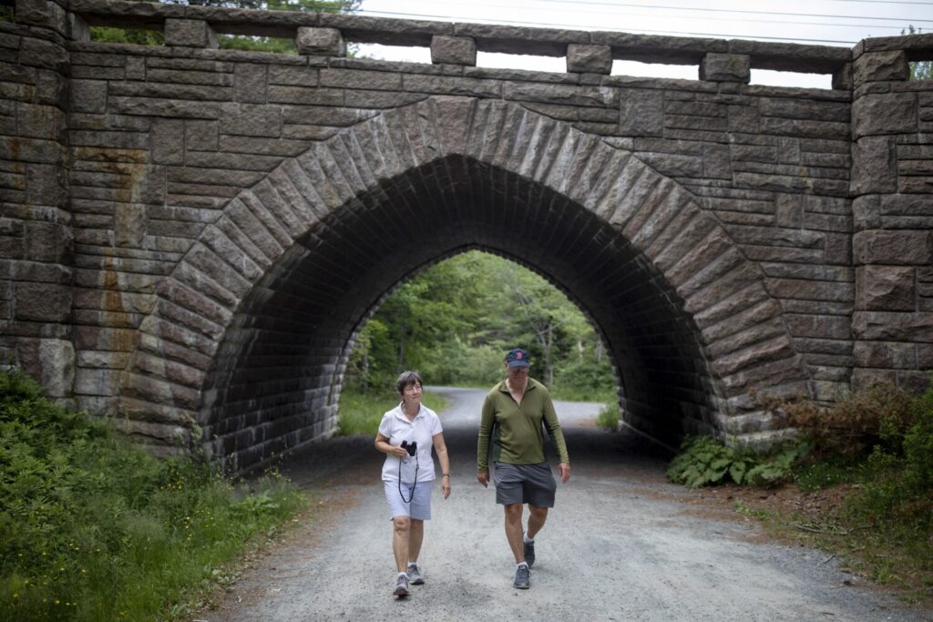 Joan and Mike Furnari walk along a carriage trail at Acadia National Park on June 25. The couple, who live in Southwest Harbor, both worked as seasonal rangers at the park, Mike for 30 years and Joan for 20 years, and they walk along the carriage roads in the park almost every day. The couple said it has been quiet in the park, but that they have noticed an increase in visitors over the past week and expect the amount of visitors to continue to rise as the summer goes on. Brianna Soukup/Staff Photographer
