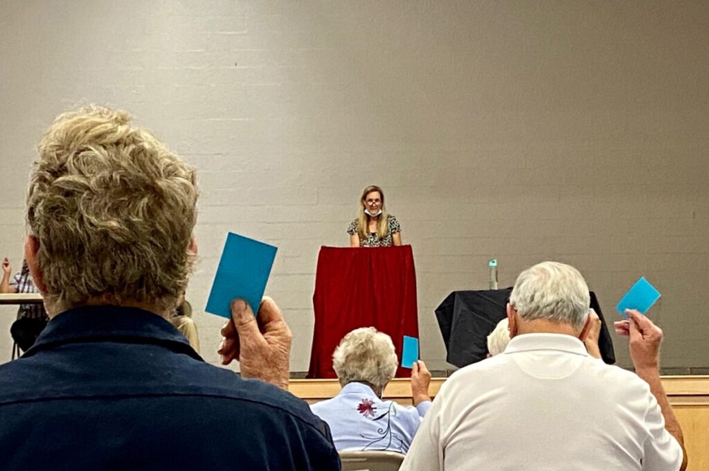 Farmingdale residents hold blue cards in the air Thursday while voting on an article during the annual Town Meeting. Sam Shepherd/Kennebec Journal