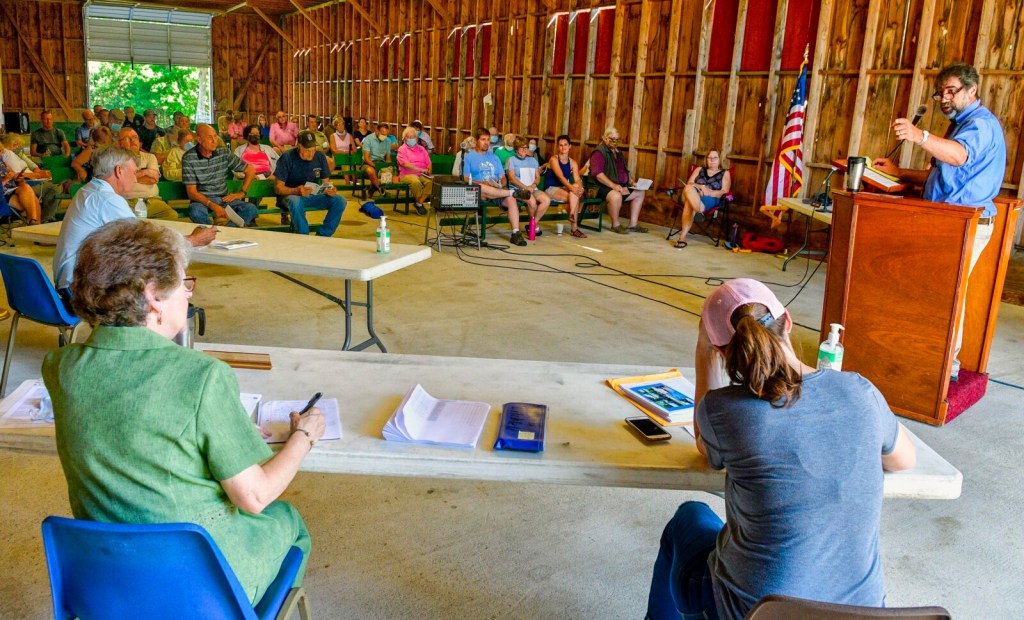 Selectman Gary Parker speaks Saturday during Town Meeting in a barn at the Litchfield Fairgrounds. Joe Phelan/Kennebec Journal Buy this Photo