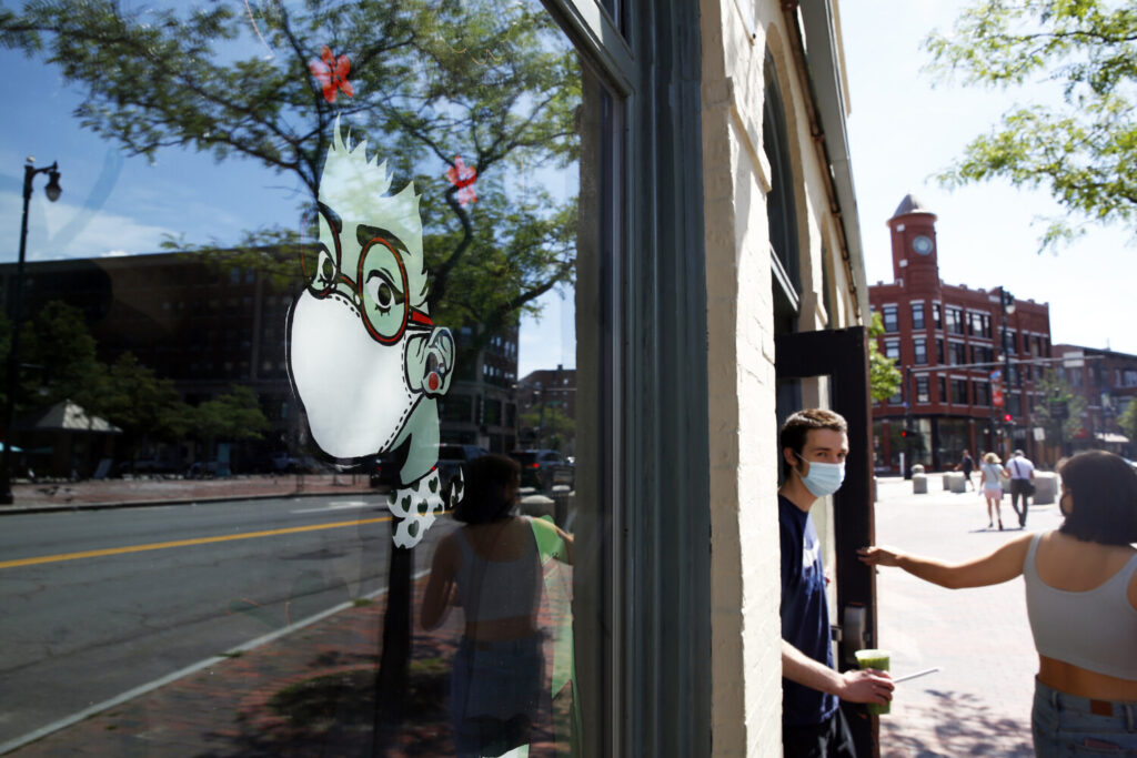A window painting at Starbucks on Congress Street depicts a mask-wearing woman. Ben McCanna/Staff Photographer