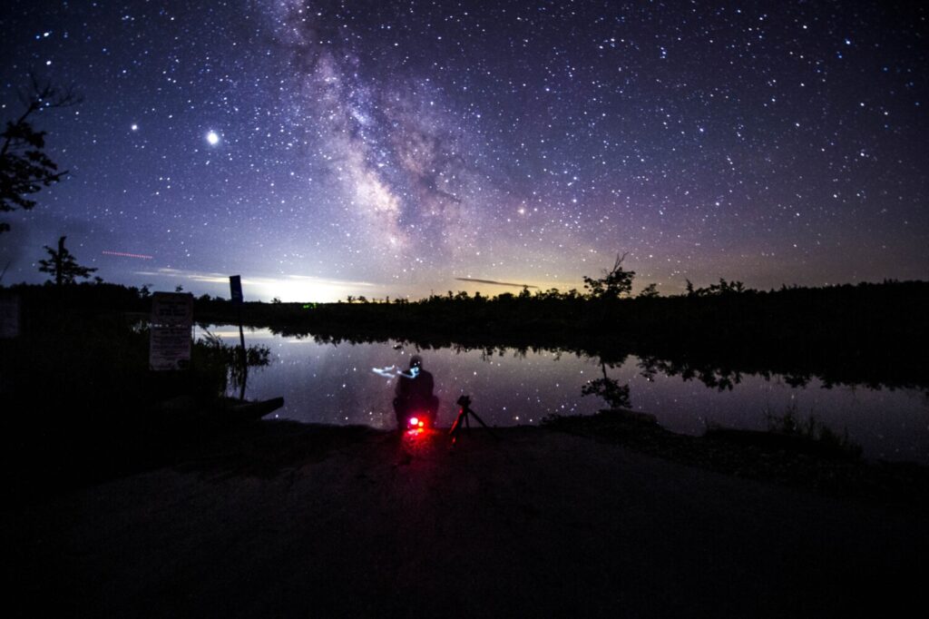 Kyle Grantham, a professional photographer from Delaware, makes a picture of the Milky Way after making pictures Tuesday of his true objective, Comet NEOWISE, at the water’s edge of the Narrows on North Pond in Smithfield. The celestial event happens once every 6,800 years, making it a unique experience justifying the 1,200 mile round trip for only 4 hours of shooting. Michael G. Seamans/Morning Sentinel