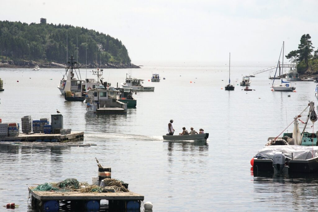 People cross Mackerel Cove on Bailey Island in a skiff on Tuesday. Farther out in the cove, around the point of land at the top left in this photo, a woman was attacked and killed by a great white shark on Monday. Gregory Rec/Staff Photographer