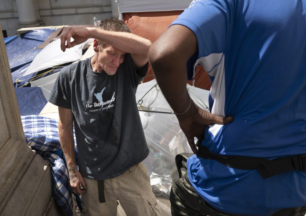 One 49-year-old man staying at the encampment, who gave his name only as Raymond, said he appreciates how he’s been allowed to have a tent and a sense of home while staying at City Hall, and recognized the assistance volunteers have provided.