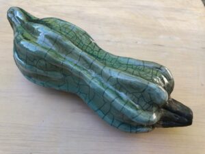 “Crackle Zucchini,” Anne Alexander of Windham, Raku fired ceramic, 3 by 3 by 10 inch. Photo courtesy of Maine Farmland Trust Gallery