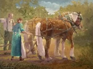 This show encompasses 53 works from 18 artists in a wide range of media to depict the rich history of farming in Maine, including oil, acrylic, and watercolor paintings, charcoal, ink, and pastel drawings, 3-D wooden assemblage, ceramic vegetables, full-color photography, plus black and white photographs and glass plate photographic prints on loan from the Penobscot Marine Museum. The gallery is partnering with the Penobscot Marine Museum to exhibit seven glass plate photographic prints on loan from the Eastern Collection, of oxen, draft horse teams and scenes of the harvests of corn and potatoes.
