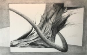 “Scythe, Modus Operandi,” Therese L. Provenzano of Wallagrass, charcoal on paper, 26 by 40 inch. Photo courtesy of Maine Farmland Trust Gallery