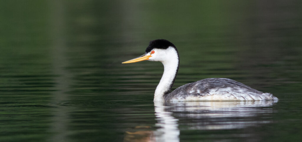 Normally, this time of year, the Clark’s grebe would be out west, such as in the Montana or Utah area, from where it would migrate to the west coast. This grebe appears to have settled in nicely on Togus Pond.