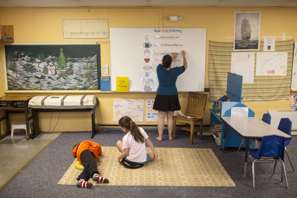 Cliff Island school during the first week of classes last year as teacher Jenny Baum starts the year with a lesson in “whole body listening” to the school’s two students. Brianna Soukup/Staff Photographer