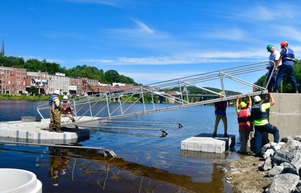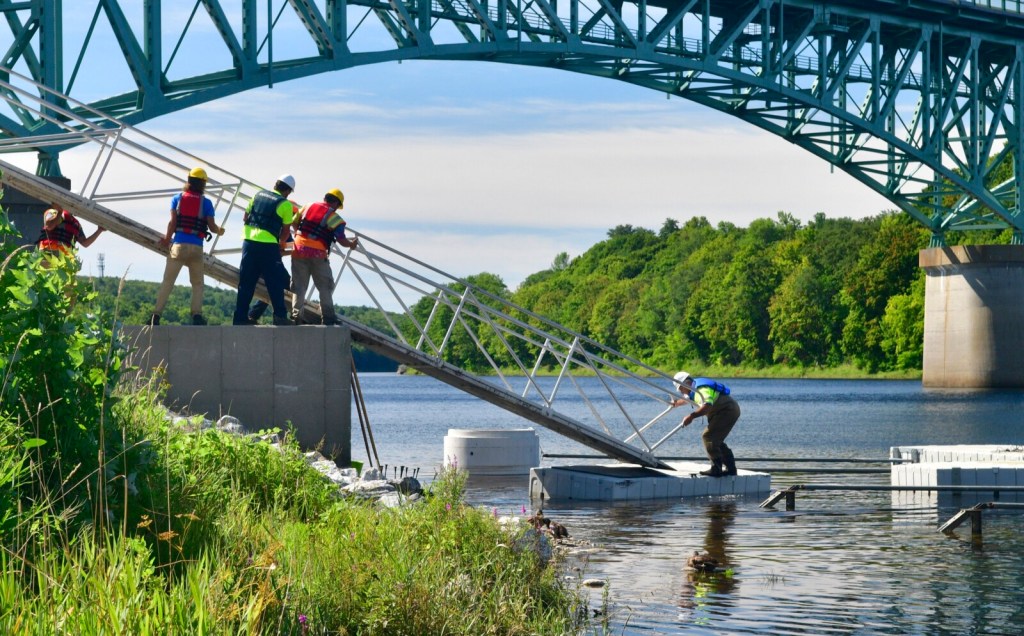 AUGUSTA — A floating dock was installed to new bases on the banks of the Kennebec River on Friday, as workers shored up the East Side Boat Landing spot after destructive ice damage more than two years ago.