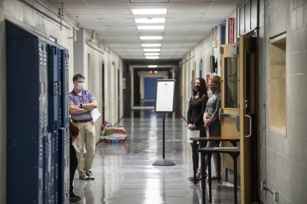 Erica Pelotte, center, and Jennifer Bergeron, right, wait in a hallway of Mid-Maine Technical Center on Tuesday for their opportunity to address the Waterville City Council. Michael G. Seamans/Morning Sentinel