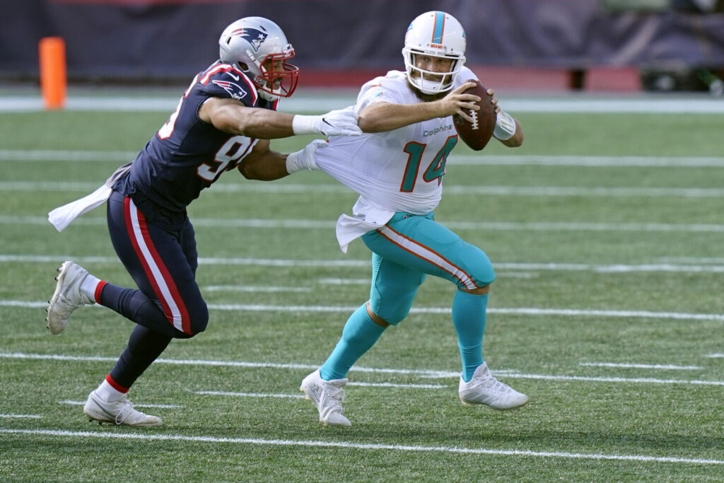 New England Patriots defensive end Derek Rivers chases Miami Dolphins quarterback Ryan Fitzpatrick in the second half of the Patriots’ 21-11 win Sunday in Foxborough, Mass. Steven Senne/Associated Press