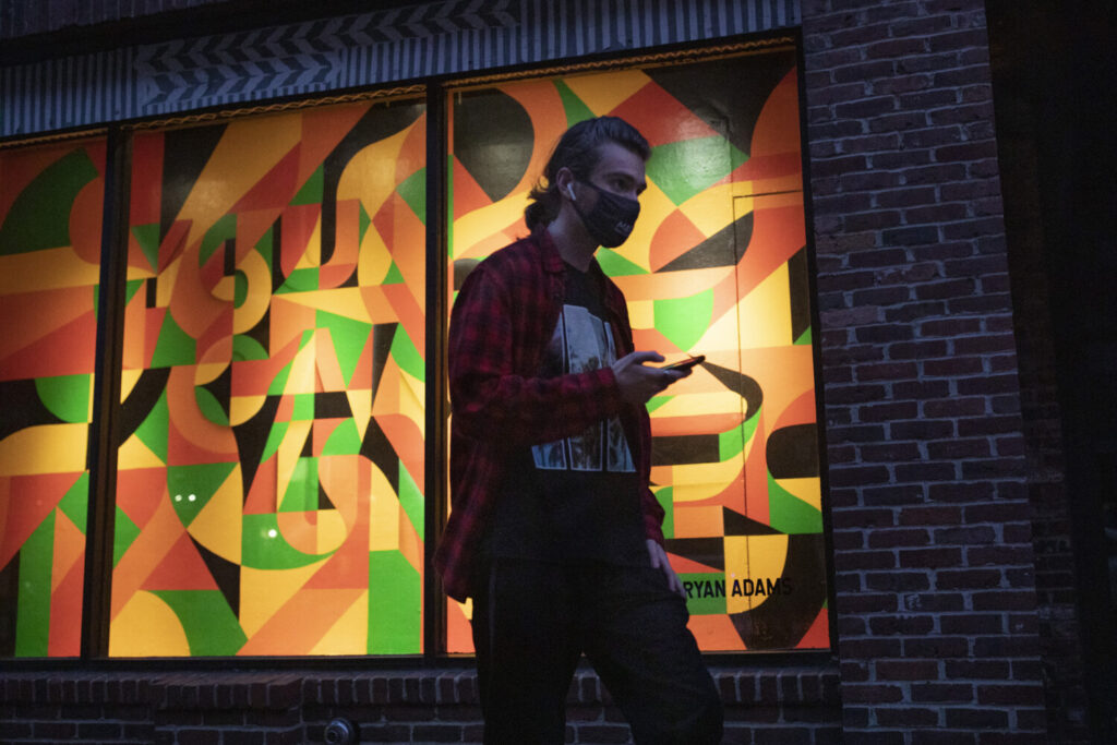 A pedestrian walks past a piece of art titled, “You Can’t Unsee,” by artist Ryan Adams in the window of Space in downtown Portland on Aug. 31. Brianna Soukup/Staff Photographer
