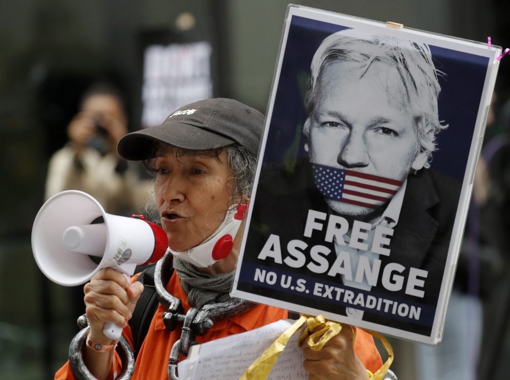 Julian Assange supporters protest outside the Old Bailey in London, Monday, Sept. 7. Lawyers for WikiLeaks founder Julian Assange and the U.S. government were squaring off in a London court on Monday at a high-stakes extradition case delayed by the coronavirus pandemic. American prosecutors have indicted the 49-year-old Australian on 18 espionage and computer misuse charges over the WikiLeaks publication of secret U.S. military documents a decade ago. AP Photo/Frank Augstein