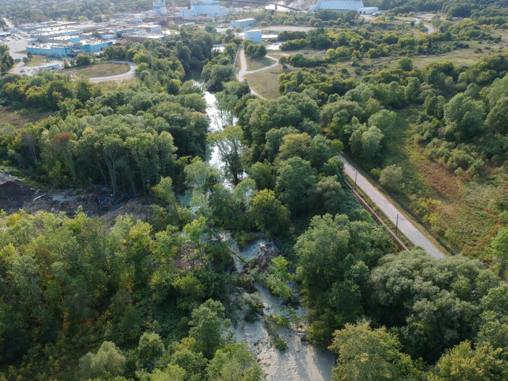A drone photograph of the landslide that occurred Wednesday on the Presumpscot River behind Les Wiison & Sons at 161 Warren Ave., Westbrook. Photo by Henry Riley Productions