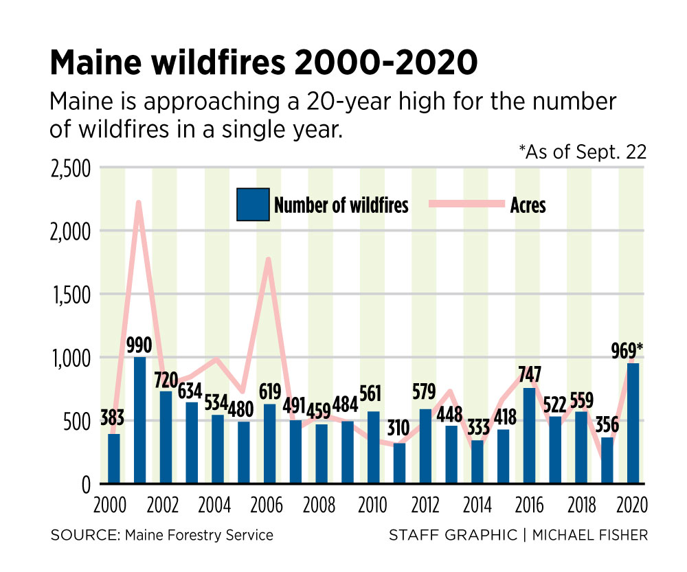 Already, the scant rainfall this year has put 2020 on pace to potentially exceed 1,000 wildfires, more than in any of the past 20 years, Currier said. As of Tuesday, Maine Forest Rangers counted 969 total wildfires in the state that have destroyed about 985 acres of forest. The number is a stark increase from last year’s wet and rainy summer, when there were only 356 fires, he said.