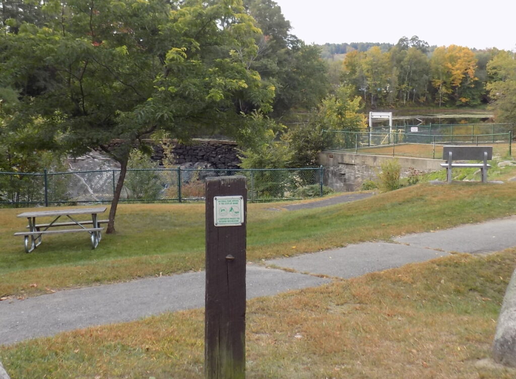 Part of Walton’s Mill Pond Park as seen on Sept. 22. The dam in the background will be removed and improvements made to the park next year. Pam Harnden/Livermore Falls Advertiser
