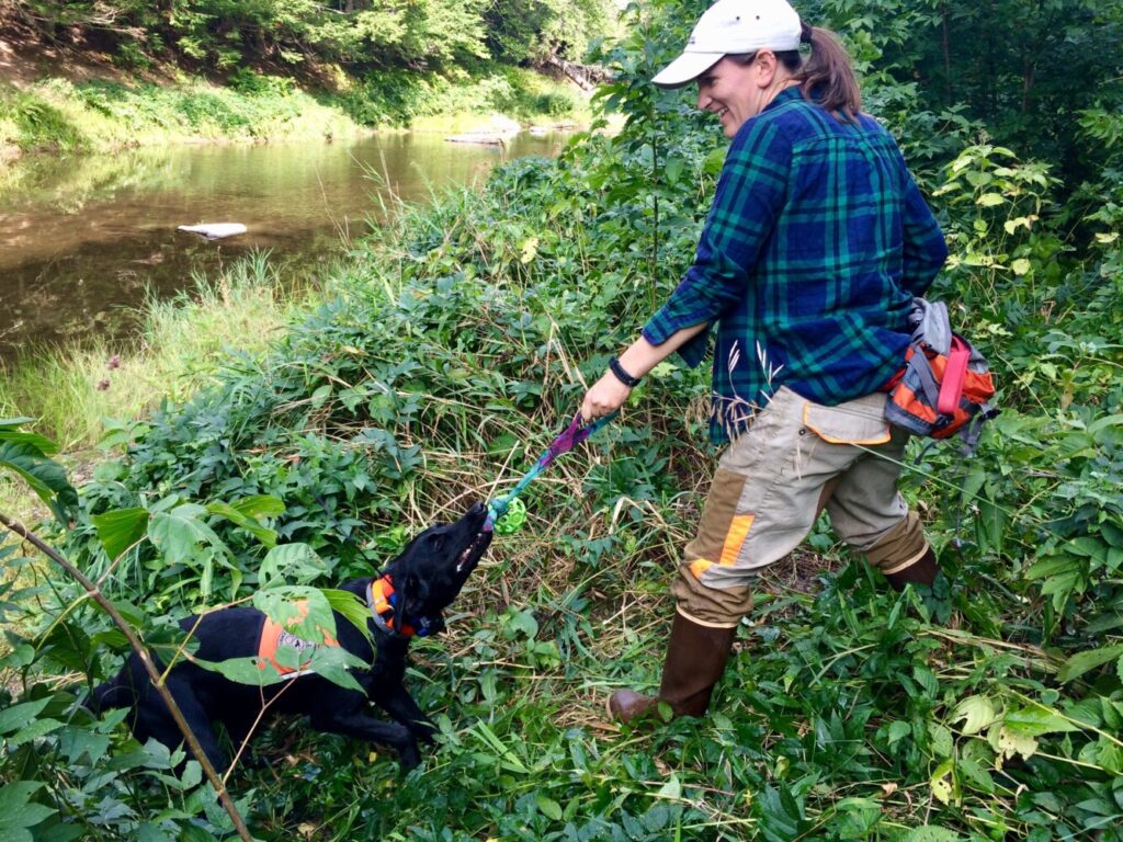 Dog handler Lindsay Ware of Ellsworth prepares to search for wood turtles near a stream in Waldo County with her tracking dog, Chili. Deirdre Fleming photo