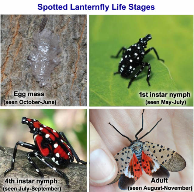 The spotted lanternfly is shown at various life stages. Image from maine.gov