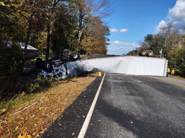 A semi truck rolled over Wednesday afternoon on state Route 3 in Vassalboro when its driver swerved to avoid a pickup truck. A section of Route 3 was closed for about five hours while emergency workers dealt with the accident. No one was injured, according to officials. Vassalboro Fire Department photo