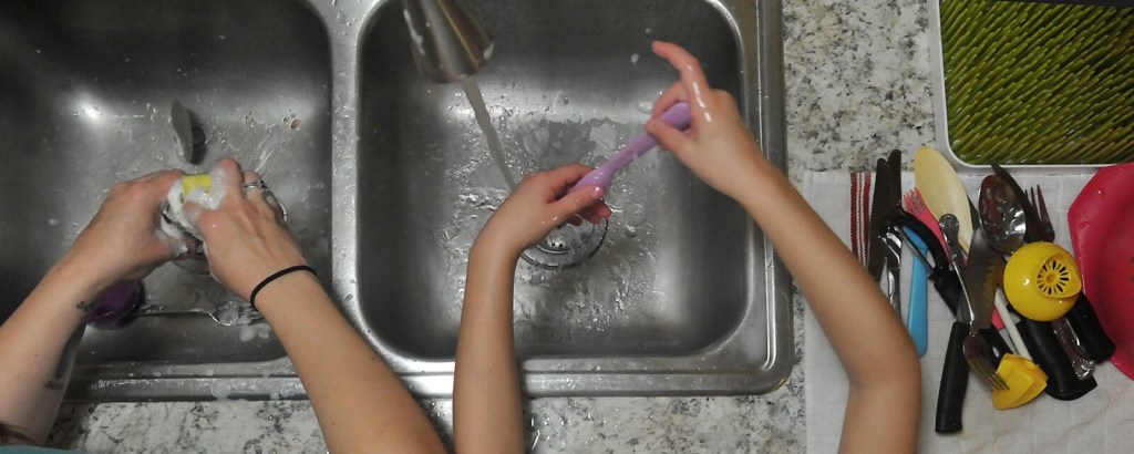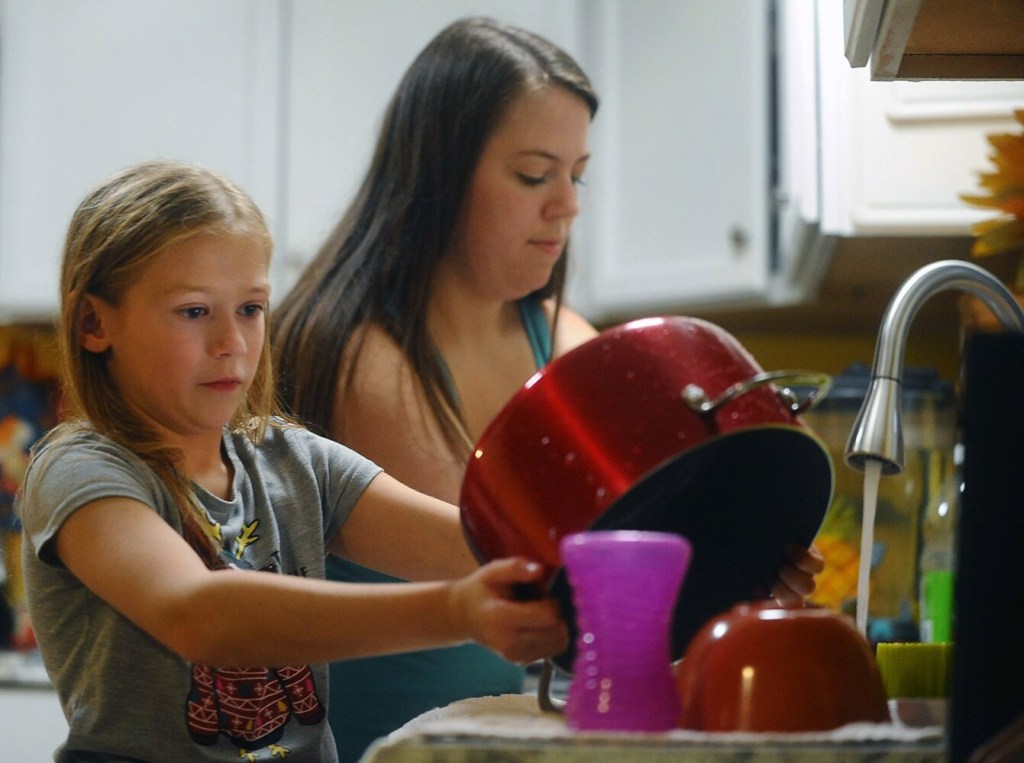Sofia Hamblet, 9, and mother Tia Pratt wash dishes by hand during the hour they have to use pressurized water at their home in Benton Monday. During that time Pratt’s three children also receive baths and toilet tanks are filled The family of five and others at Averill’s Mobile Home Park have had limited water usage over the past two weeks due to well problems at the park. Rich Abrahamson/Morning Sentinel Buy this Photo