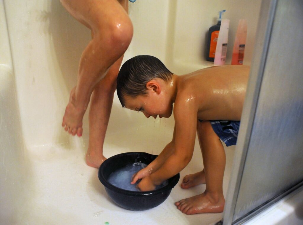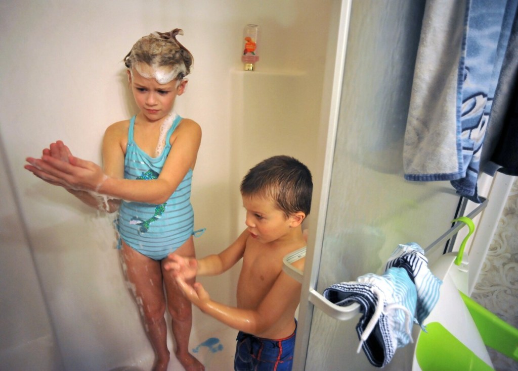 Water sprinkles overhead as Dominic Pratt, 4, right, and sister Sofia, 9, take a shared shower to conserve water at their Benton home Monday. The kids’ mother, Tia, who helps her children with showering, said the kids wear bathing suits for privacy during the shared showers. The family of five have an hour each night to use pressurized water for bathing, washing dishes and filling toilet tanks. The family and others at Averill’s Mobile Home Park have had limited water usage over the past two weeks due to well problems at the park. Rich Abrahamson/Morning Sentinel Buy this Photo