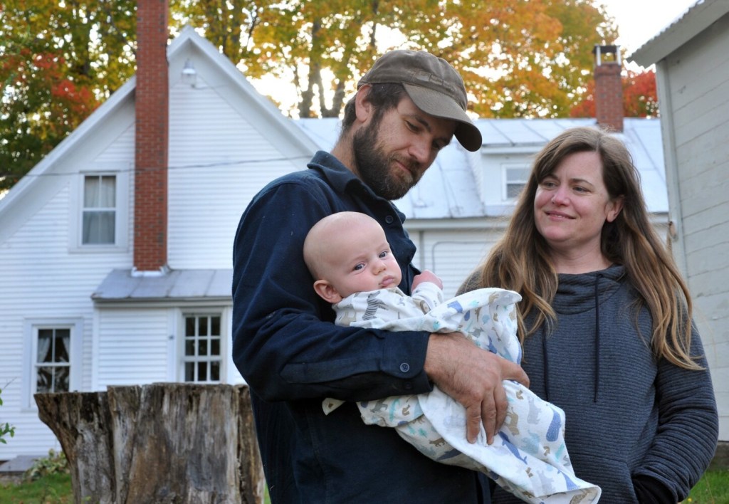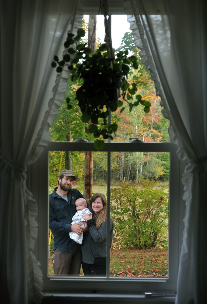 Emily Eckhardt shows photographs from 1900 of farmhouse she and partner, Dillon Robinson, have recently bought in Embden. Robinson stands in the background with their son, Woodbury, who is 3 months old. Rich Abrahamson/Morning Sentinel Buy this Photo