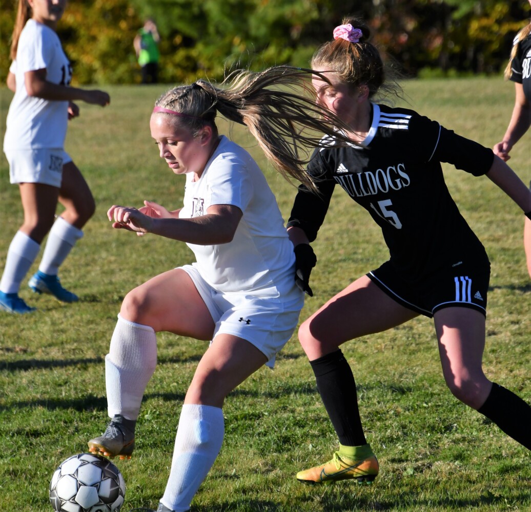 Monmouth’s Alicen Burnham tries to keep the ball away from Hall-Dale defender Rita Benoit during a game Monday. Contributed photo/Laurie Gifford