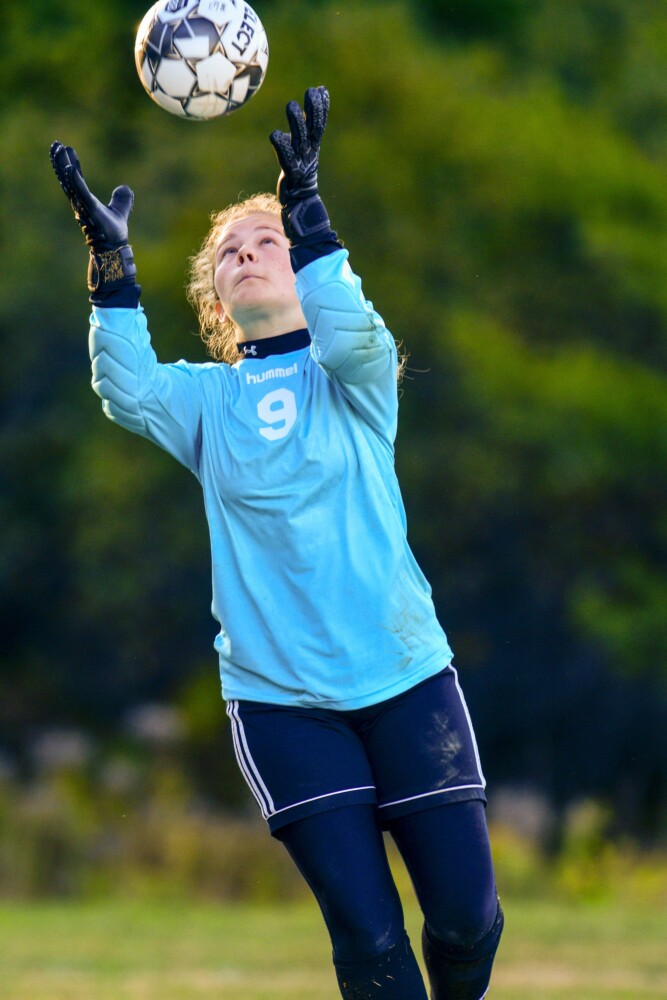 Richmond keeper Liz Johnson catches a ball during a game against Monmouth on Wednesday in Richmond. Joe Phelan/Kennebec Journal Buy this Photo