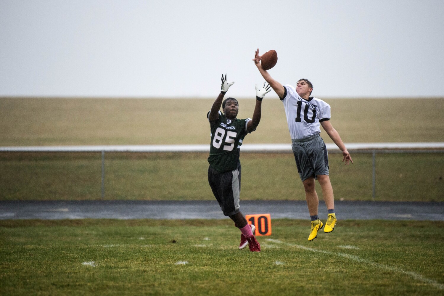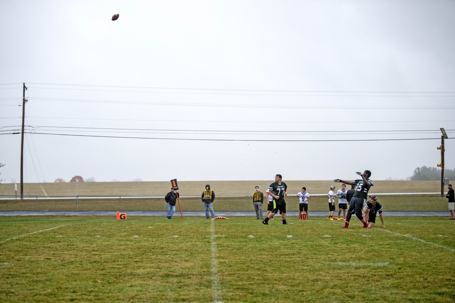 Mount View receiver Ryan Kirby,left, can’t come up with this pass during a 7-on-7 flag football game against Maranacook last Friday in Thorndike. Michael G. Seamans/Morning Sentinel