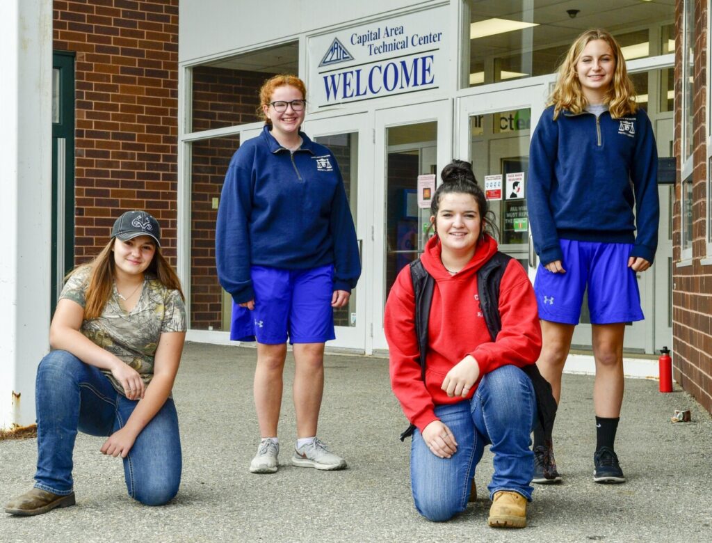 Students Emily York, left, Emma Shaw, Megan Wright and Hanna Spitzer gather Friday at Capital Area Technical Center in Augusta. Joe Phelan/Kennebec Journal Buy this Photo