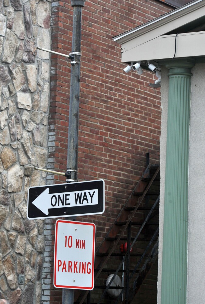 The fire escape attached to Cancun Mexican Restaurant building, left, that has enabled downtown revelers to access the rooftop of John Fortier’s State Farm Insurance building, right, at 16 Silver St. in downtown Waterville. Drug deals, urination and defecation have taken place in the alley next to the State Farm building, according to Fortier. Fortier said he’s documented the activity on six motion-activated cameras he had installed on his building overlooking the alley next to the restaurant. Four of the cameras are shown at the top right. Rich Abrahamson/Morning Sentinel Buy this Photo