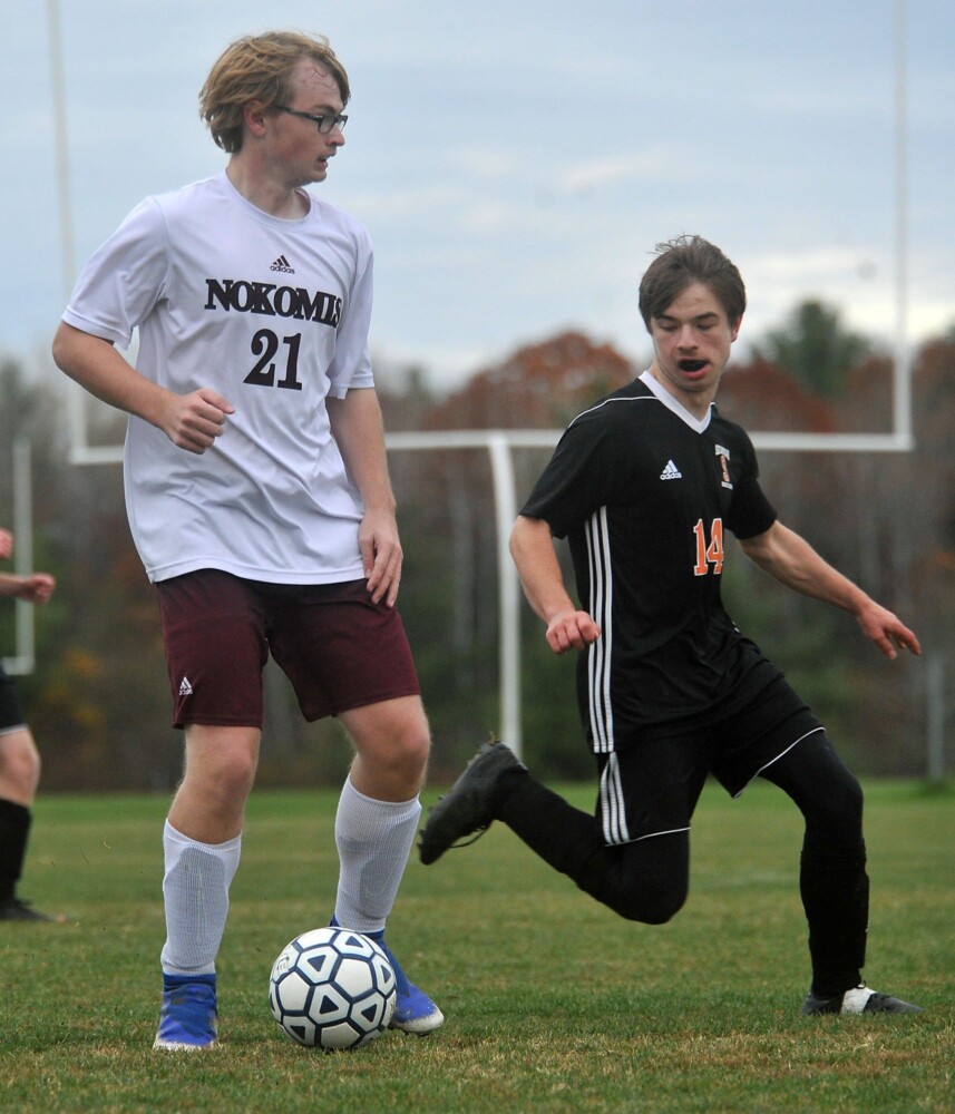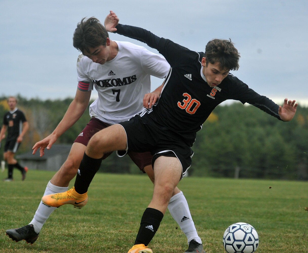 Skowhegan’s George Mitchell, right, and Nokomis’ Ryan Bell collide as they battle for control of the ball Tuesday in Skowhegan. Rich Abrahamson/Morning Sentinel Buy this Photo